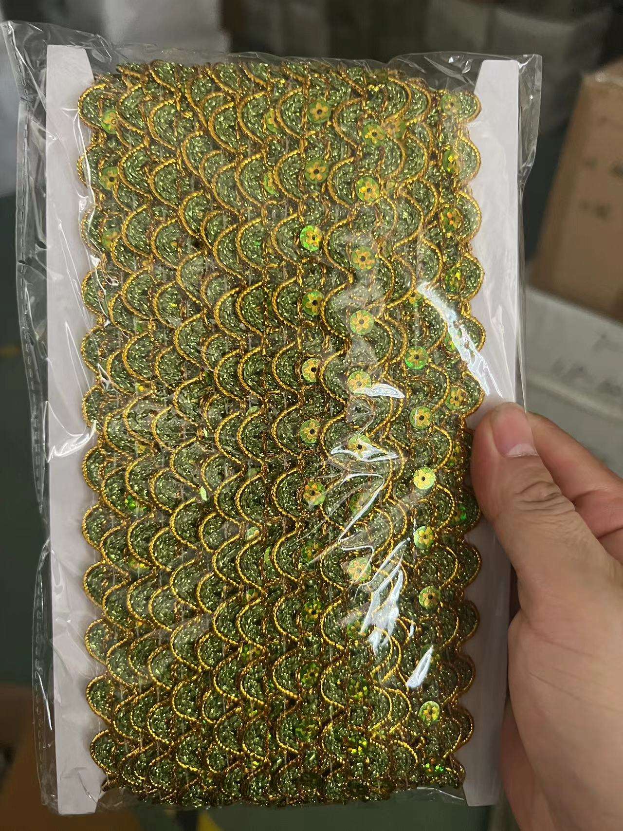 Vaatteiden tarvikkeet Kulta- ja hopeametalliset reunapitsi-verhoilumetalliset kultaiset paljetit kirjonta-nauhan trimmi omaksuu metallin paljettin kirjontatekniikan ja yhdistyvät onttoon pitsisuunnitteluun, joten se sopii vaatteiden lisävarusteisiin.