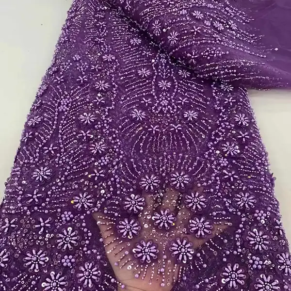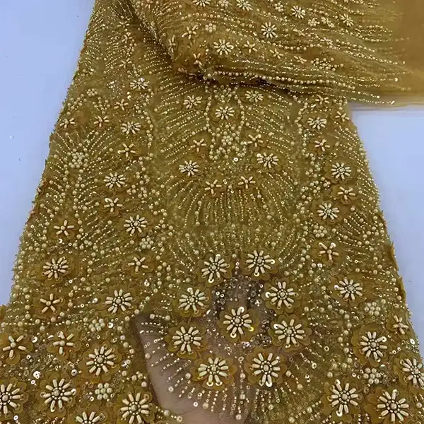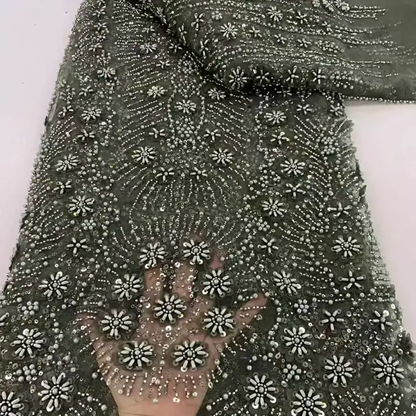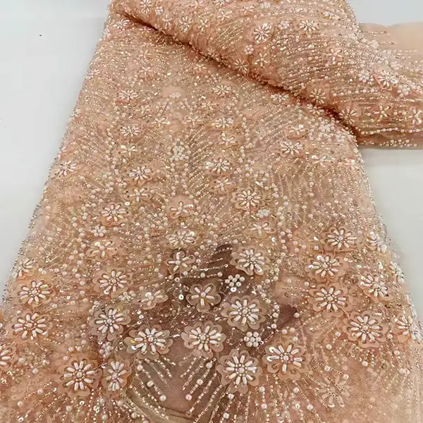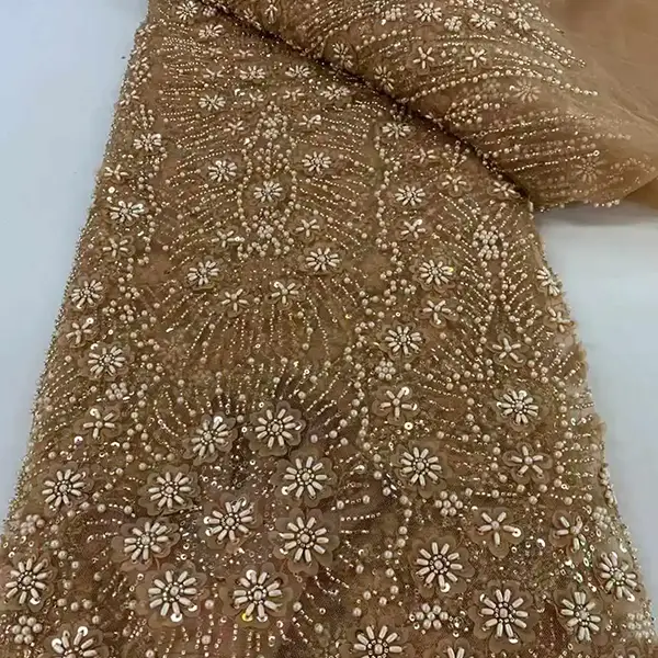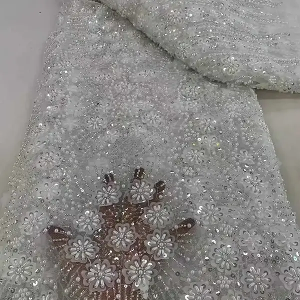 Ylellinen raskas valmistettu kirjonta -tyllihelmien pitsi silmähelmillä varustettu kangas, jossa on monimutkainen helmi ja herkkä pitsi. Suurten tiheyden ompeleminen ja käsin levitetyt helmet luovat ylellisen tekstuurin, täydellisesti morsiamen kylpytakit, iltapuku ja haute couture. Tyylikäs, säteilevä ja korkealaatuinen laatu.