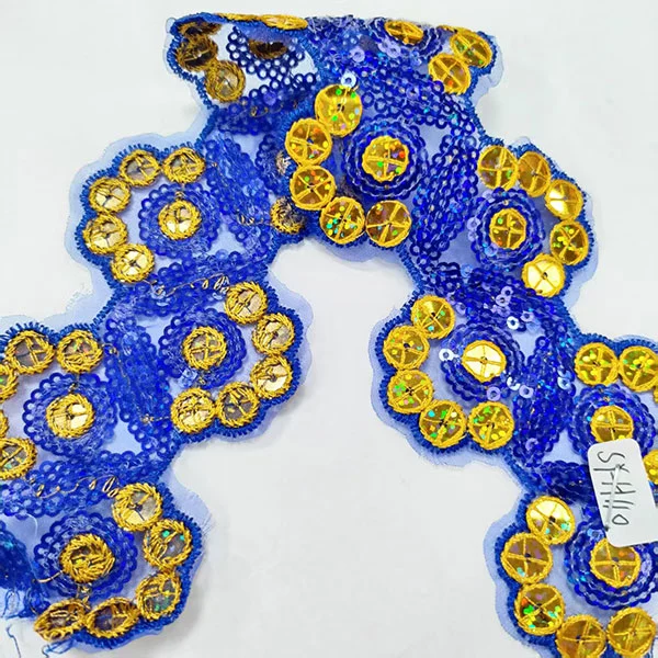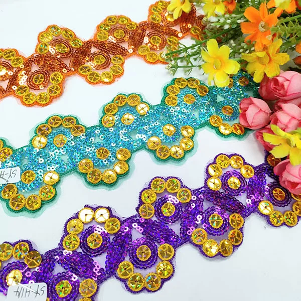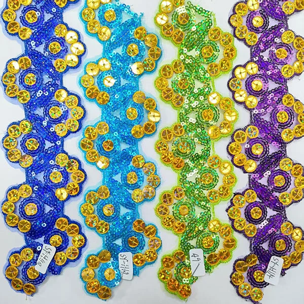 Kirjonta moniväriset paljetit Mesh -pitsileikkaus on koristeellinen tyyppinen pitsi -verhoilu, joka sisältää monimutkaisia kirjontaa, värikkäitä paljeteja ja verkkopohja. Tämän tyyppistä leikkaamista käytetään yleisesti muotisuunnittelussa ja käsityössä lisätäksesi ripauksen kimaltelua ja glamouria vaatteisiin, asusteisiin ja kodinsisustustuotteisiin.