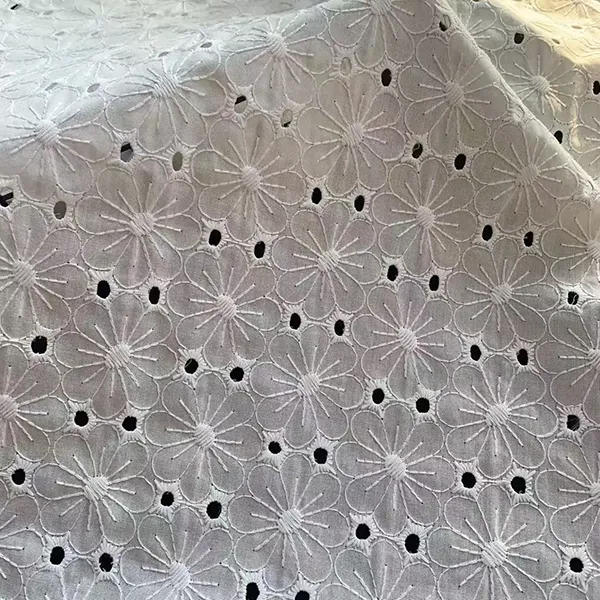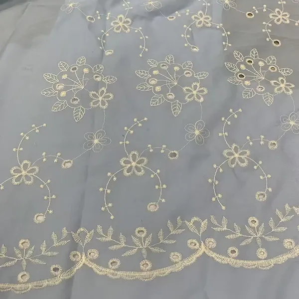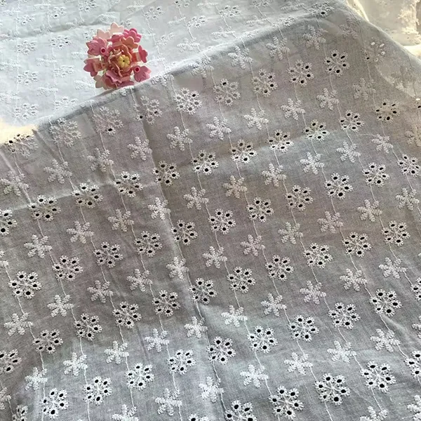Valkoisen puuvillan pitsi -kirjonta -silmukkakangas pukeutumiseen Tässä tyylikkäässä pitsikangassa on herkkä kirjonta ja silmukka -leikkaus, joka luo hengittävän, kevyen materiaalin, joka on täydellinen mekkoihin, puseroihin ja morsiamenvaatteisiin. Monimutkaiset kukkakuviot ja scalloped reunat lisäävät romanttisen, vintage -viehätysvoiman, kun taas luonnollinen puuvilla varmistaa pehmeyden ja mukavuuden.